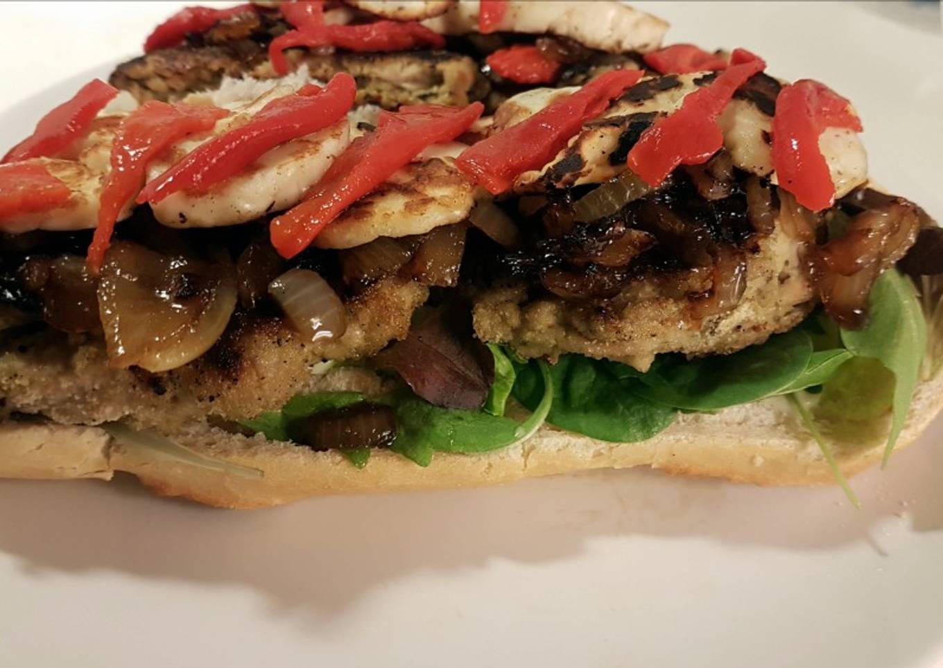 - Montamos en este orden: pan, ruccula, hamburguesa, cebolla caramelizada, halloumi y por último las tiras de pimiento asado.