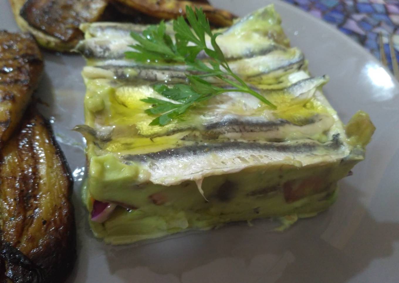 - Hacemos la base colocando los boquerones con el lado blanco hacia arriba. Ponemos una capade crema de aguacate. A continuación ponemos una capa de tomate y otra de lechugas variadas. Finalmente cerraremos con una última capa de crema de aguacate y presionaremos con fuerza para que quede todo compacto.