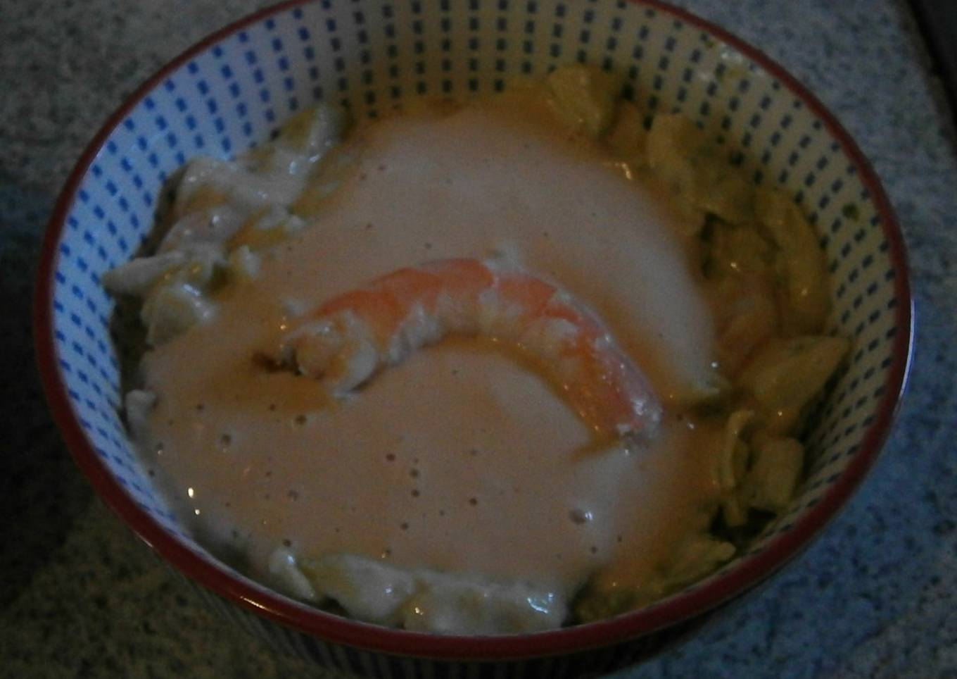 - Se añade entonces la salsa rosa a la mezcla langostino/aguacate/cebolla, reservándose cierta cantidad, y mezclándolo todo bien con una cuchara. Con dicho compuesto formado, se van rellenando las dos cáscaras del aguacate o mejor aún: rellena un par de cuencos, que quedan chulos, como en la foto. Una vez rellenados los cuencos, se finaliza la receta untando cierta cantidad de la salsa rosa reservada y se pone además encima el langostino entero que nos quedaba. Verás que rico está.