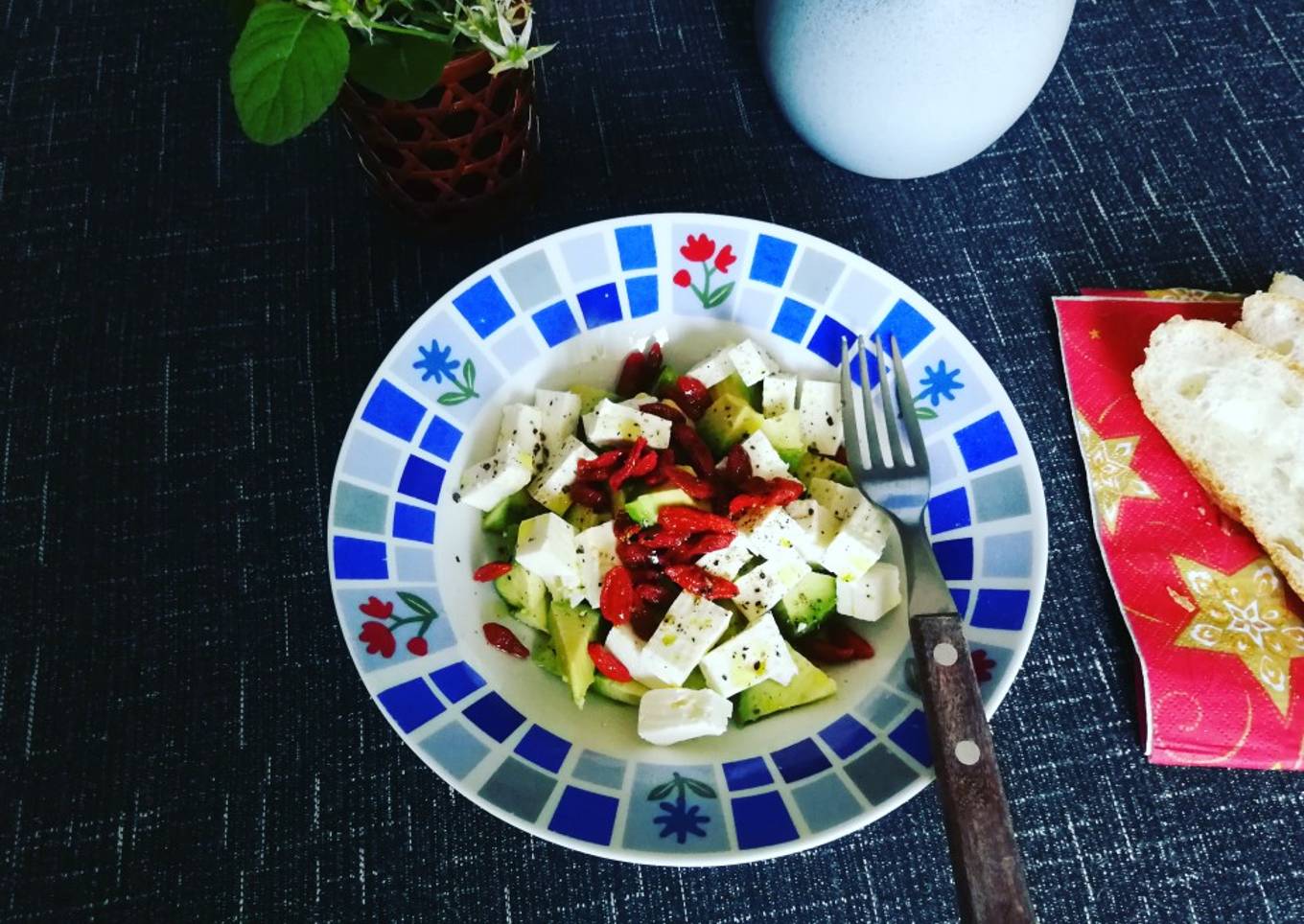 - Coloca la pulpa de aguacate y el queso feta en un bol. Añade las bayas goji bien escurridas.