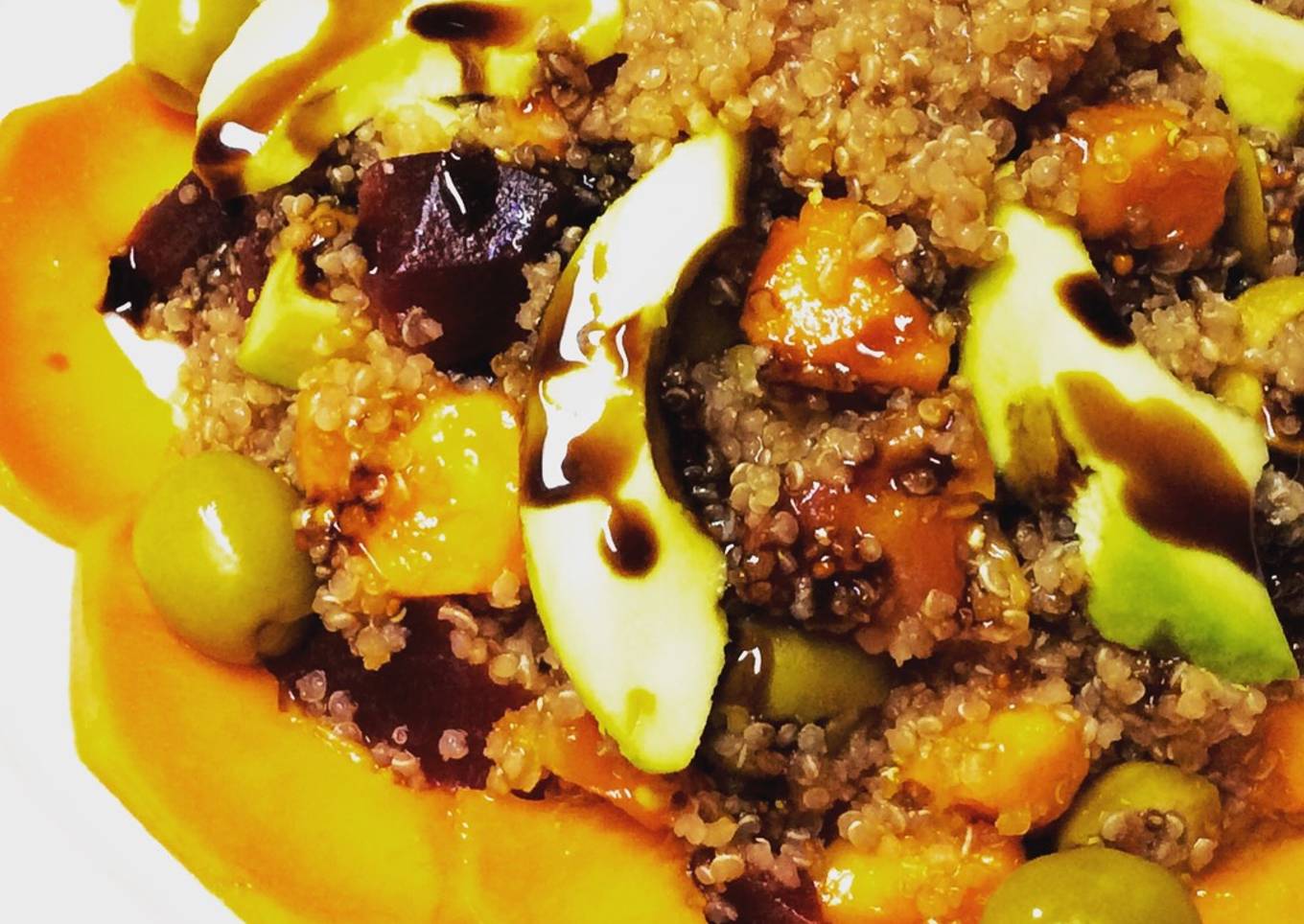 - Emplatar poniendo unos gajos de aguacate encima de la quinoa, la papaya y aceitunas alrededor, echando un chorrito de crema de modena por encima.