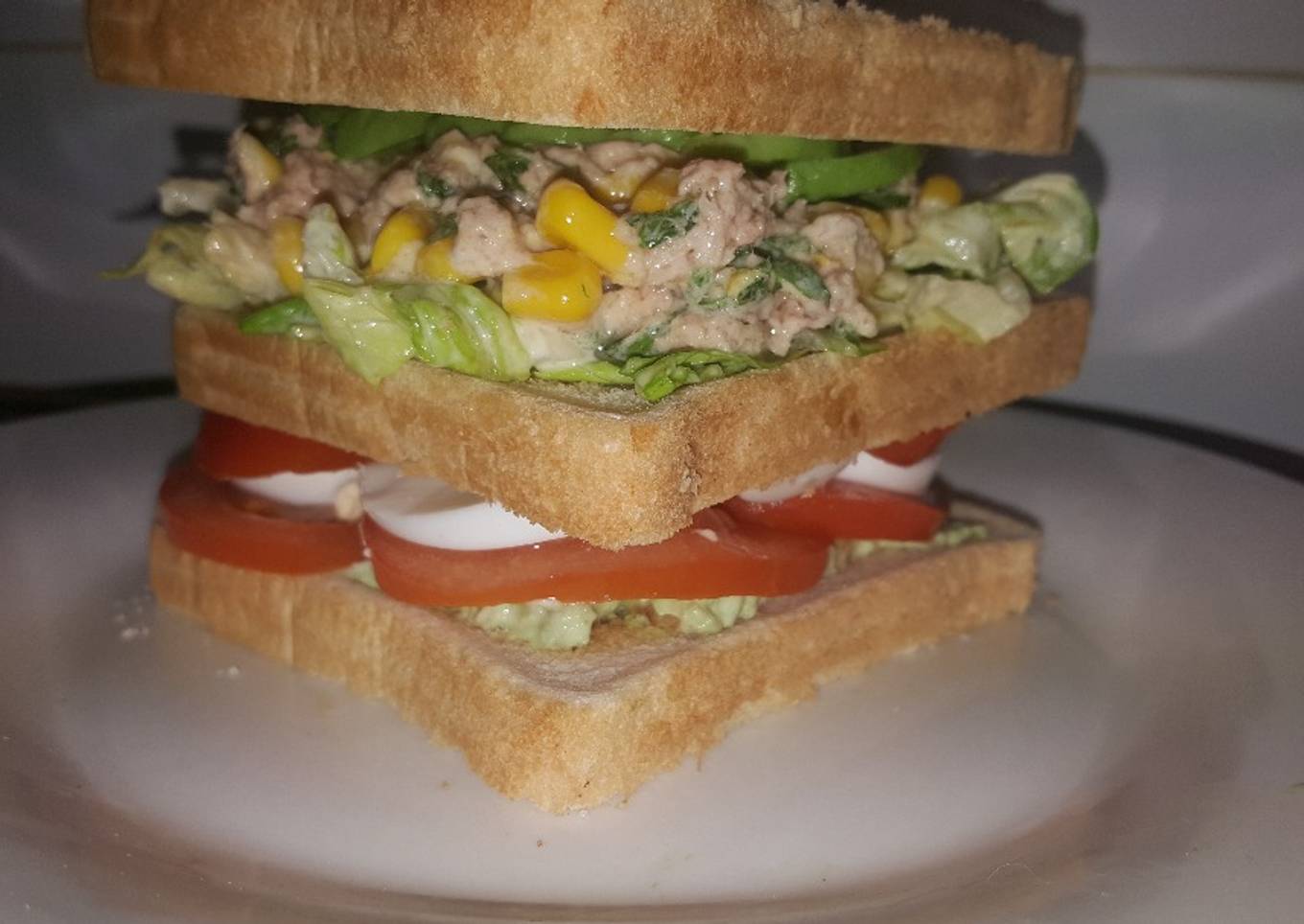 - Para montar el sándwich untar la rebanada de abajo con la crema de aguacate, cubrir con las lonchas de tomate y huevo.