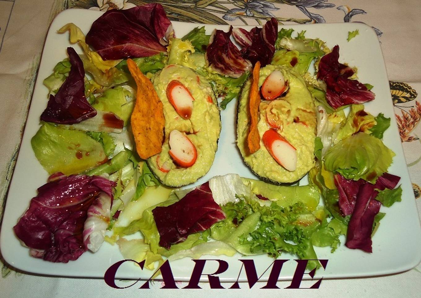 Receta de contraste. El aguacate, con hummus (crema de garbanzos) y surimi. Los he acompañado de una ensalada y Doritos están riquisimos . Muy apropiados para una cena.
