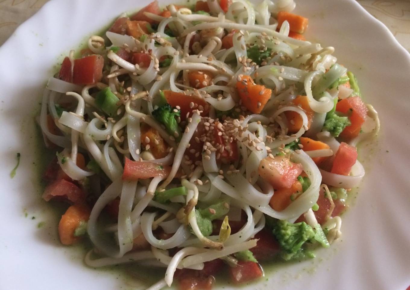 Nunca había probado los espaguetis de arroz y he decidido estrenarme con esta receta. Combina verduras cocinadas (brócoli y batata) y verduras crudas (tomate y brotes de soja).