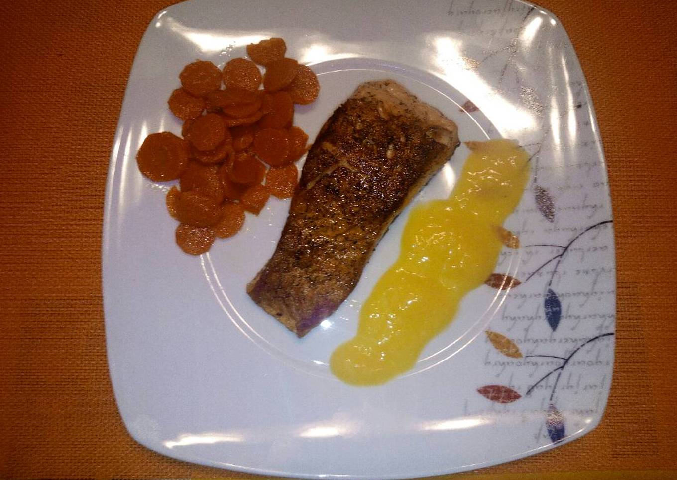 Salmón al eneldo, zanahoria caramelizada, salsa mango cítrica