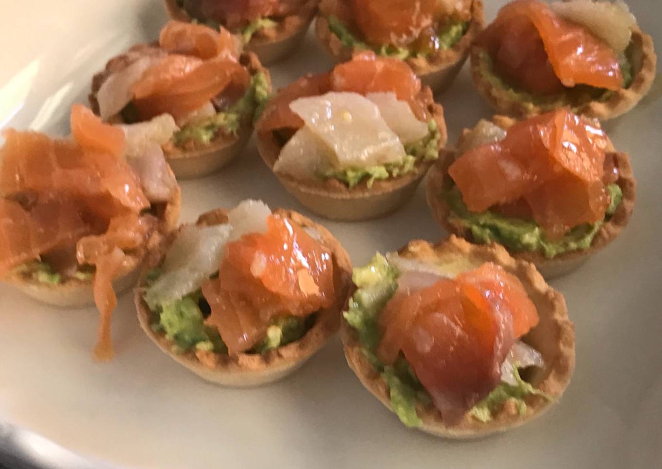 Tartaletas de salmón y bacalao ahumados con aguacate