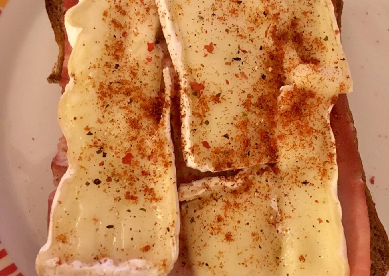 Tosta picante de aguacate, jamón y Camembert