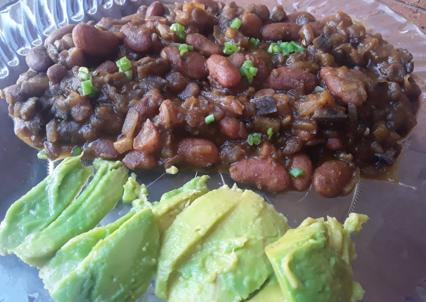 Es un guisado de cebolla morada, berenjena en cubos salteada, salsa tomate casera de mi recetario y frijoles rojos, todo sazonado con aj铆 en polvo, pimienta, ajo y cebolla en polvo... es un guiso delicioso para acompa帽ar con arroz 贸 quinoa y aguacate...馃槉馃槈馃槝