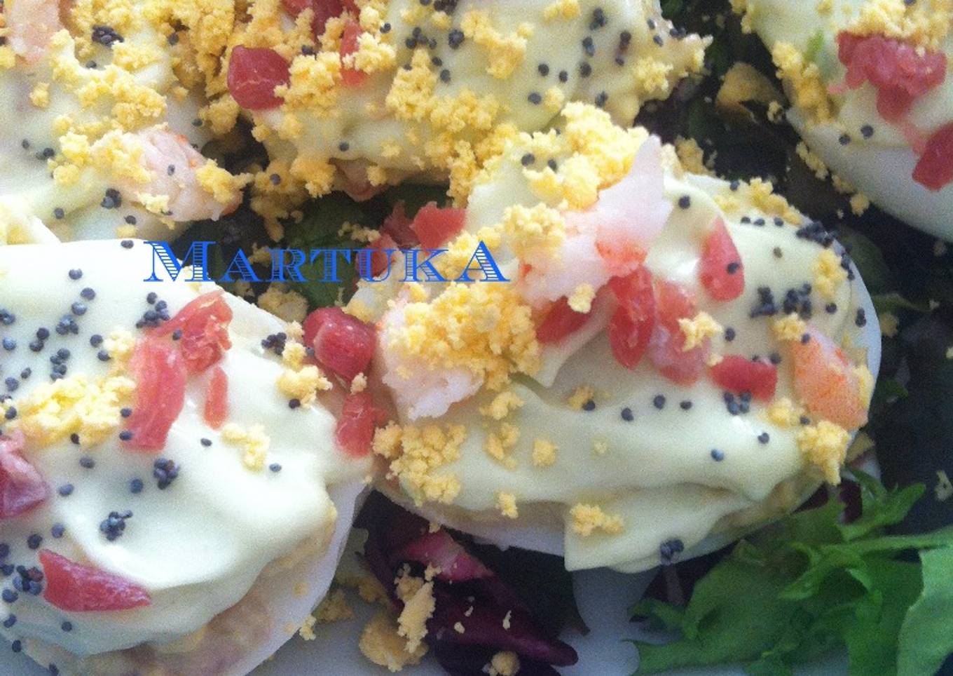 Huevos rellenos de langostinos y serrano con mayonesa de aguacate