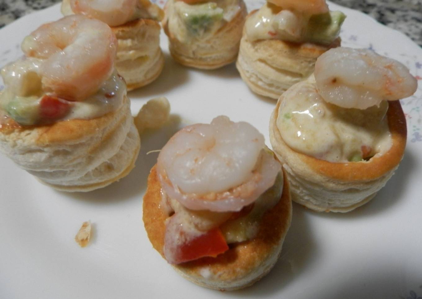 - Por último rellenamos los volovanes con la mezcla y colocamos una gamba entera encima y ya servimos.