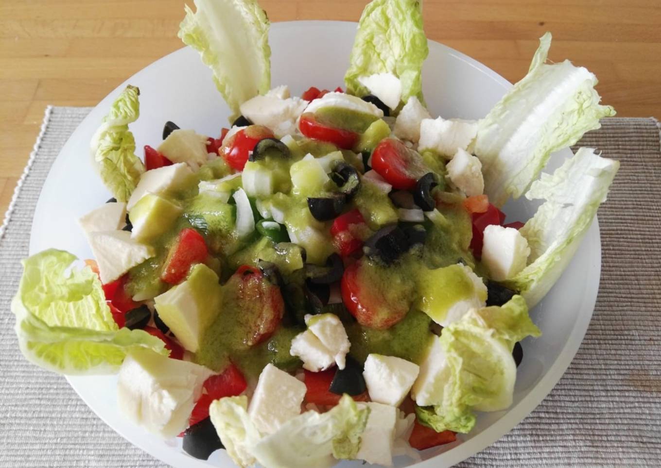 - Picar los pimietos, cebolla, aceitunas y mozzarella. Colocar sobre el arroz.