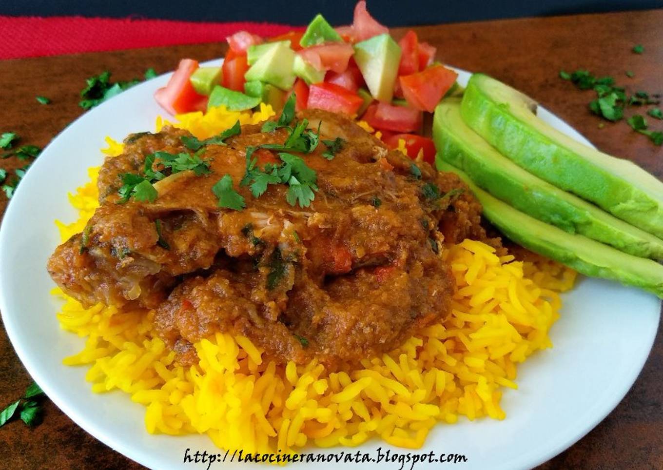 Y luego viene la cuestión de cómo se sirve el seco de pollo. Obligado el arroz amarillo y plátano macho frito. Yo paso de hacer frituras, por lo que preparé el arroz amarillo (arroz blanco con azafrán, no me compliqué mucho) y una ensalada de tomate y aguacate. Más o menos como lo hace Laylita.